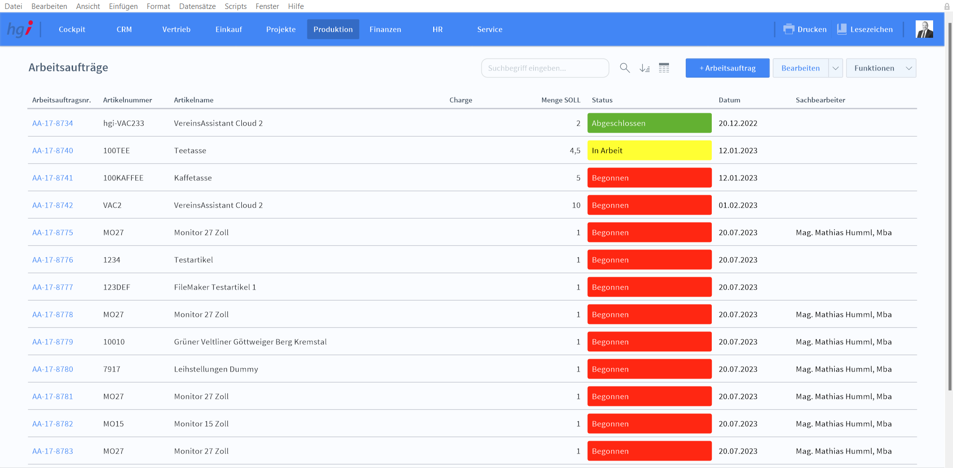 Die Arbeitsaufträge mit Anweisungen können ausgedruckt werden. Wird der Arbeitsauftrag als erledigt zurückgemeldet werden die Stücklistenartikel abgebucht und die fertig produzierten Artikel ans Lager gebucht.