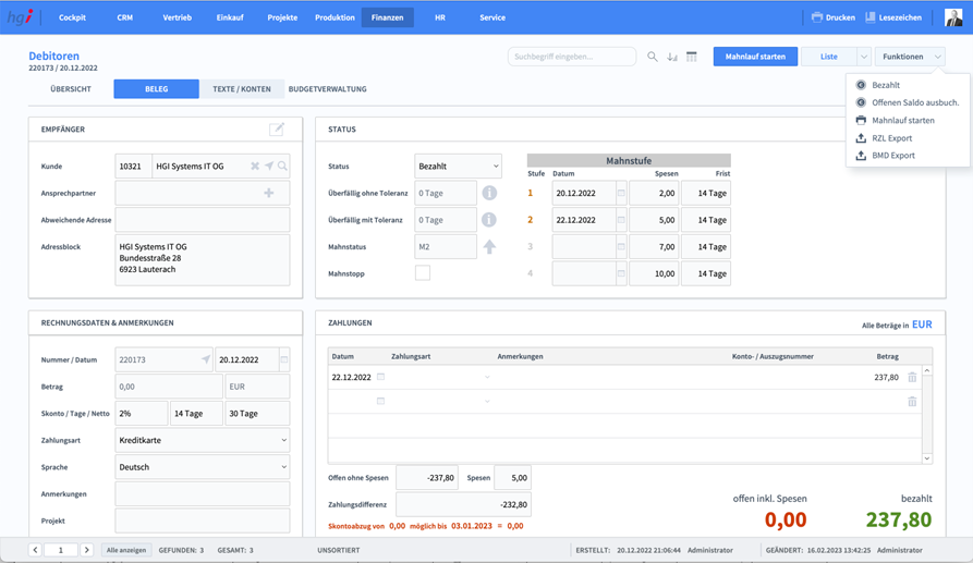 Der Mahnlauf erstellt automatisch die nötigen Mahnbelege und erhöht den jeweiligen Mahnstatus. Vorbereitete Schnittstellen in die Buchhaltungssysteme BMD und RZL ermöglichen das digitale Ausspielen der Belege für die Buchhaltung. Berichte und Listen stehen für diverse Auswertungen ebenfalls zur Verfügung.