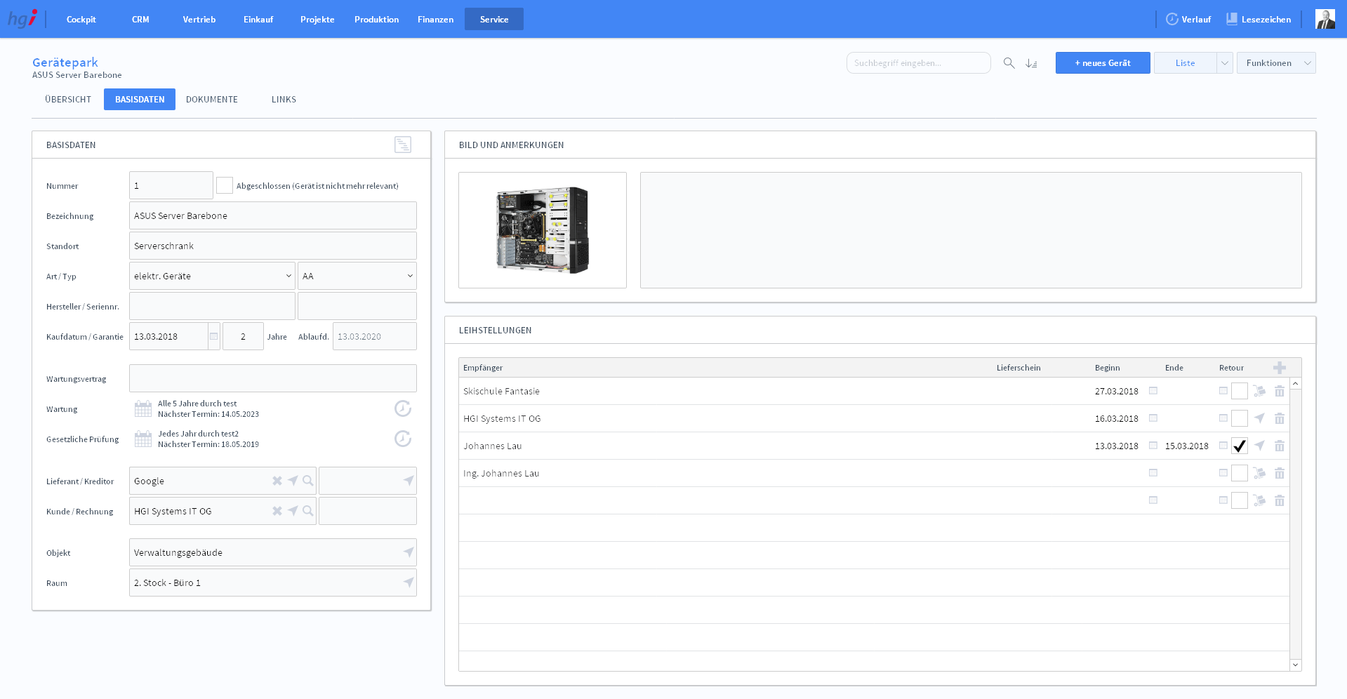 Mit den Modulen Gerätepark, Objekte und Fahrzeuge können interne oder Auftragsbezogene Daten verwaltet werden. So kann über das Modul Geräte z.B. eine Kunden-Anlage verwaltet werden. Die User auf einen Blick die Garantiezeiträume, Seriennummer, Fotos, die benötigten Ersatzteile, usw.