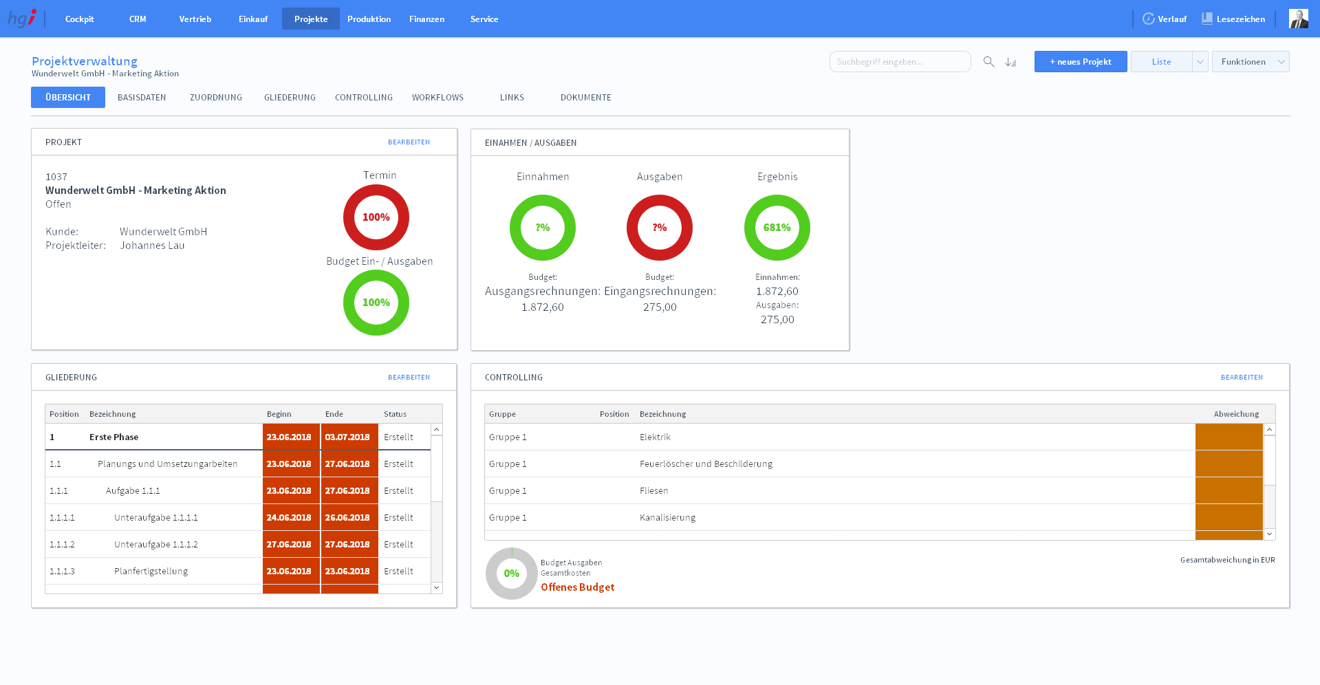 Über die Eingabe der Stammdaten erhält jedes Projekt seinen Rahmen, wie eine Nummer, eine Bezeichnung, Verantwortliche, Start- und Enddatum oder das Budget. Zusätzlich kann ein Projektzeitplan bzw. eine Projektgliederung aus einem Vorlagenordner geladen werden. Gliederungspunkte können mit Aufgaben und Kreditoren verknüpft werden.